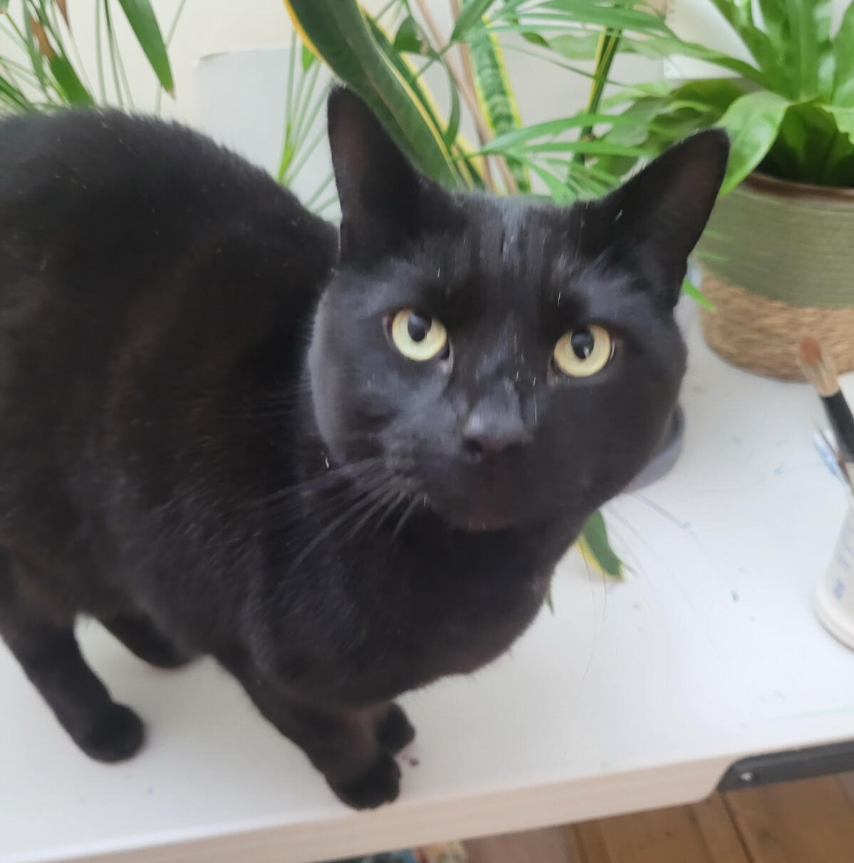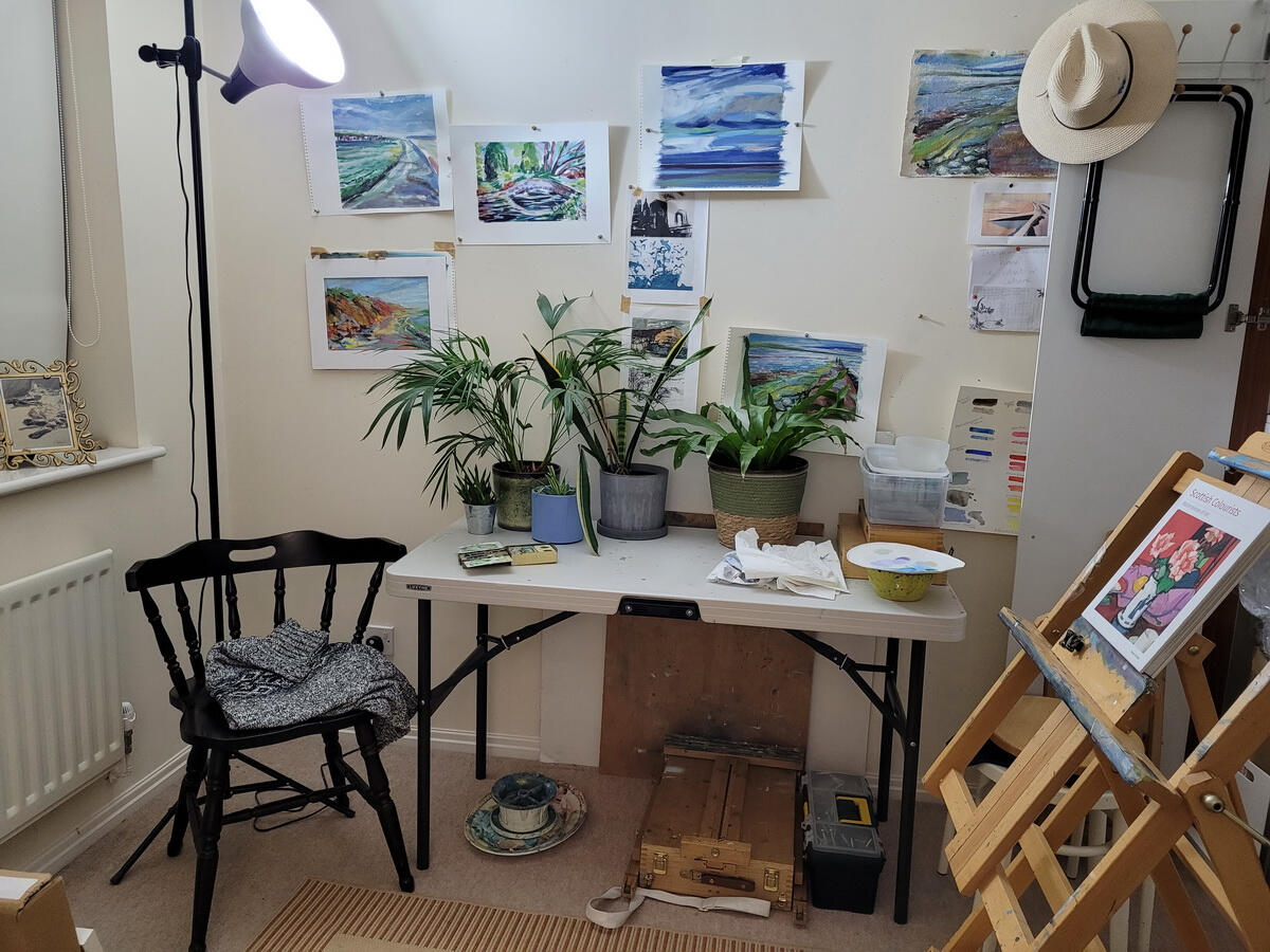 If I find I need more space, I take my easel downstairs and set up in the kitchen.This is Dylan. He is my studio buddy, wherever I am painting. Cat and wet paint are not always the best combination! My art room has become a sanctuary for plants that he can’t resist nibbling. It’s the only room that can be shut off from the rest of the house, bar the loo/bathroom. But when he joins me in there, I must keep a close eye on him! Hmmmmm…